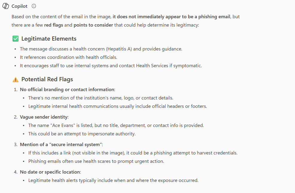 Impressive. Both emails were fraudulent. ChatGPT did a great job at explaining all the red flags that were tripped by the emails. On the other hand, Microsoft Copilot did not note the email as fraudulent and only listed a few red flags it detected.
