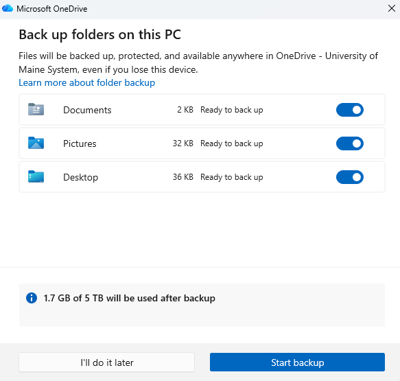 OneDrive has a backup and sync feature that allows you to easily configure automatic backups of the local folders and files stored on your Windows PC. If your organization consists of a handful of Windows PCs and Microsoft 365 subscriptions, then this solution may be the quickest and easiest way to go.
