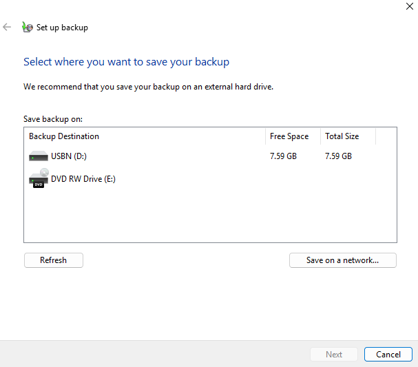 Once you have media to back up to, you must configure your operating system to backup your data. Windows has the Windows Backup program built into Windows 11. Linux has a variety of tools, such as rsync and dd. Make sure to consult your OS documentation to find the correct steps for backing up to removable media.