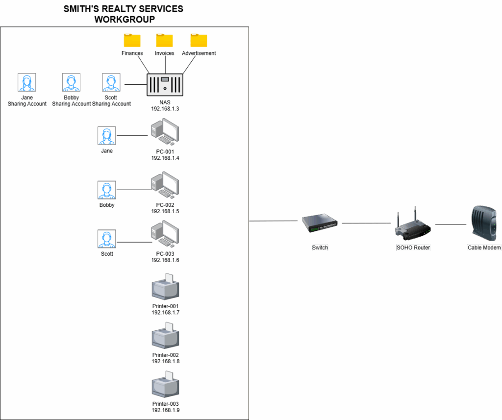 You can start to see why a workgroup isn't the most conventional network structure, and why it would be a nightmare in an organization with more than a few employees. There is a way to make file sharing a bit easier in a workgroup deployment, and that is by using a dedicated Network Attached Storage Device. By deploying a NAS on the LAN, you can configure the NAS to function as a mini domain controller, but specifically for file sharing. After connecting the NAS and assigning it with a Static IP Address, you can create file shares that employees can store files in as needed. For security and organization, try to be very specific with the names of folders and the data they store, rather than creating big unnamed folders holding dis-organized blobs of data. One the file shares are created, you can mount them on each employee workstation so that they appear as a continuous secondary hard drive. When employees want to share files/folders, they follow the normal process specified above, only the data is stored and shared on the NAS rather than their local workstation. Each employee will need a dedicated user account on the NAS operating system itself. The NAS accounts can hold the same password as their local Windows account, or for even better security, they can have a separate passwords distinguishing them from the Windows accounts. Is this a good precaution to have to slow down lateral movement if a threat actor compromises either the NAS account or the Windows account. Since file sharing is done through the NAS, there is no need to share files from the workgroup computers themselves and thus no need to create many different user accounts on each computer.