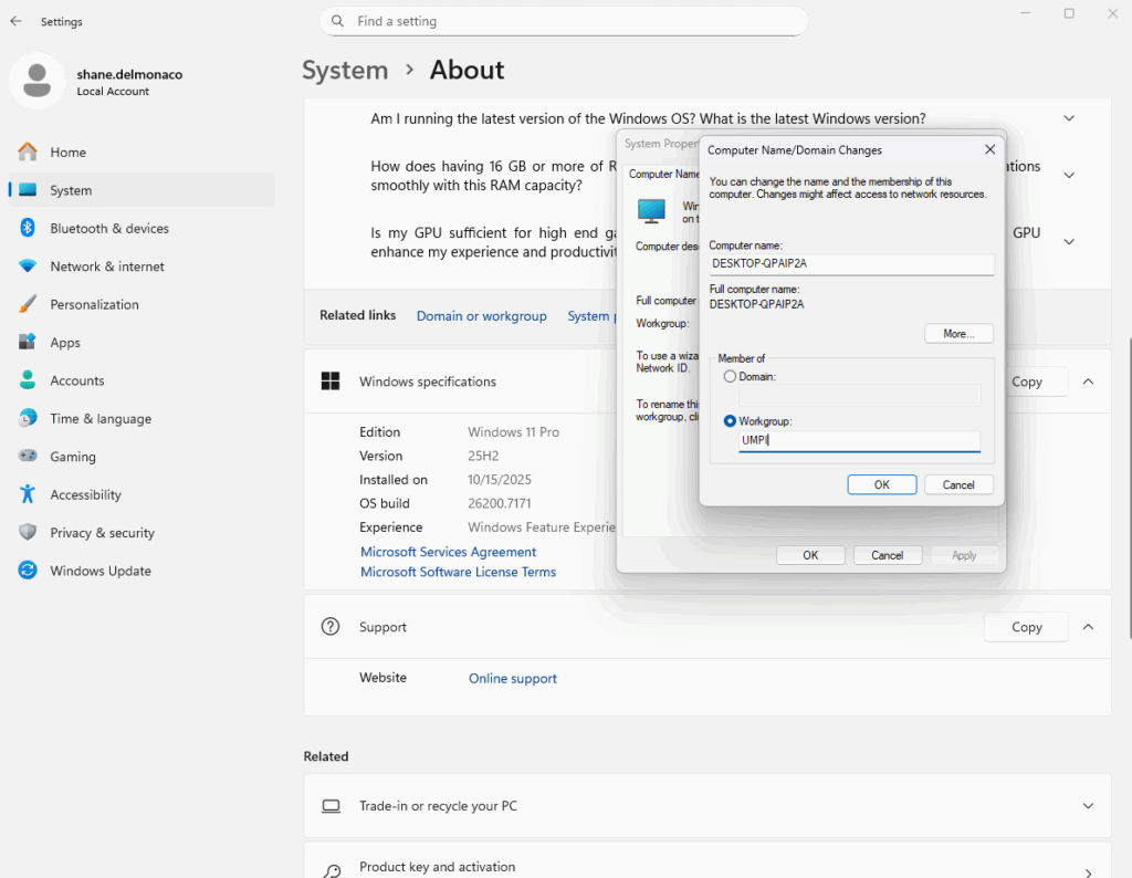 Once every system on your network is configured to your liking, you can add them all to a workgroup in the System settings snap in. This is reached via Settings -> Domain or workgroup -> Change. Workgroup should be highlighted by default, but you do need to type in the name for your workgroup. This name will be applied universally across every system you want to include in the workgroup.