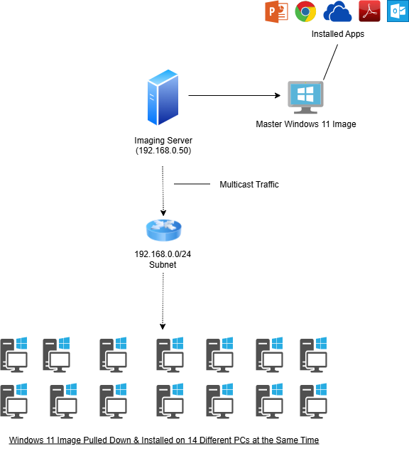 If your environment is comprised of various operating systems and various configurations determined by departments, building an imaging server to store and deploy baseline OS images may be the best choice. With this method, you start by installing an operating system on a test computer or virtual machine. You then configure the OS with all the necessary software and device settings, creating a baseline for that specific OS implementation in your workplace. When the baseline configuration is complete, you use your desktop imaging solution to capture the operating system state and store it.