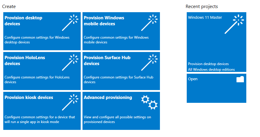 Provisioning Packages are containers created in Windows Configuration Designer that contain desired settings and applications for workplace devices. These packages are very straightforward to create and install. The Windows Configuration Designer app can be downloaded from the Windows Store. The interface is simple and presents you with options for creating packages for desktops, mobile devices, Surface Hubs, and kiosk devices. The creation process allows you to pre-specify naming conventions for devices, load Wi-Fi networks and certificates, join AD or MS Entra ID, and install applications silently in the background.