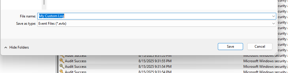 You can save your personalized log queries for further analysis using the Create Custom View setting in the Actions pane. You can also export entire logs from the Event Viewer, either an Event File or XML File.