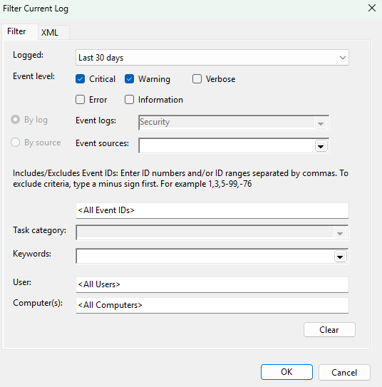 The Filter Current Log setting allows you to narrow down the events in the current log by criteria such as time, event severity, source, EventID, user, and computer. If you are looking for a specific event and have lots of information to guide your search, this is a great feature.