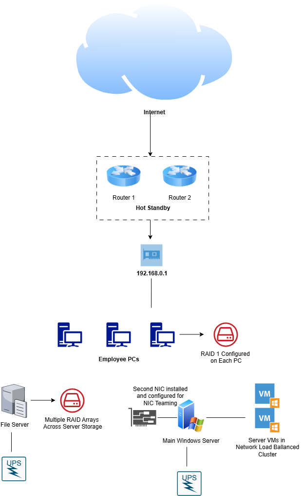 There are several failover methods you could implement in your small business network architecture. If you use hard disk drives in your employee workstations, you could look into configuring a RAID 1 array using two disks. In RAID 1, two identical hard disk drives are installed in a workstation and configured to mirror data across the two of them. This produces two identical copies of the system so that if one disk crashes, the other can take over without data loss. RAID is not a perfect system however, but this approach could be worth implementing if your workplace involves heavy daily usage of individual workstations that hold large amounts of data. If you utilize file servers/NAS devices in your environment, you could also implement RAID on them to ensure high availability to files network wide. For organizations that don’t utilize cloud storage for their internal data, this approach is highly recommended.