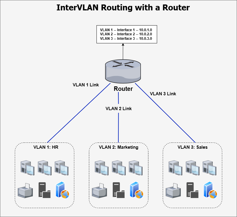 - Router: Each VLAN is connected to the router via a separate link. The router identifies the VLANs and directs traffic between them accordingly.