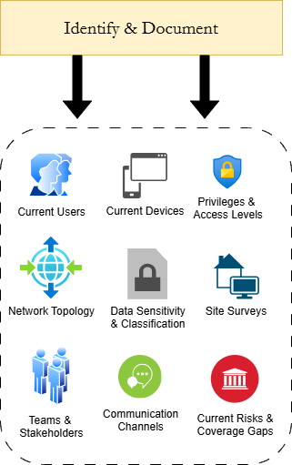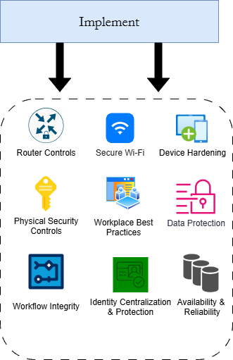 The Cyberladder Framework breaks small business cybersecurity down into three distinct stages: Identify & Document, Plan, Implement, and Educate & Test. These three stages can be used to outline the structure of your master policy. For example, the illustration below breaks down each Cyberladder stage and the key controls and policies from each one.