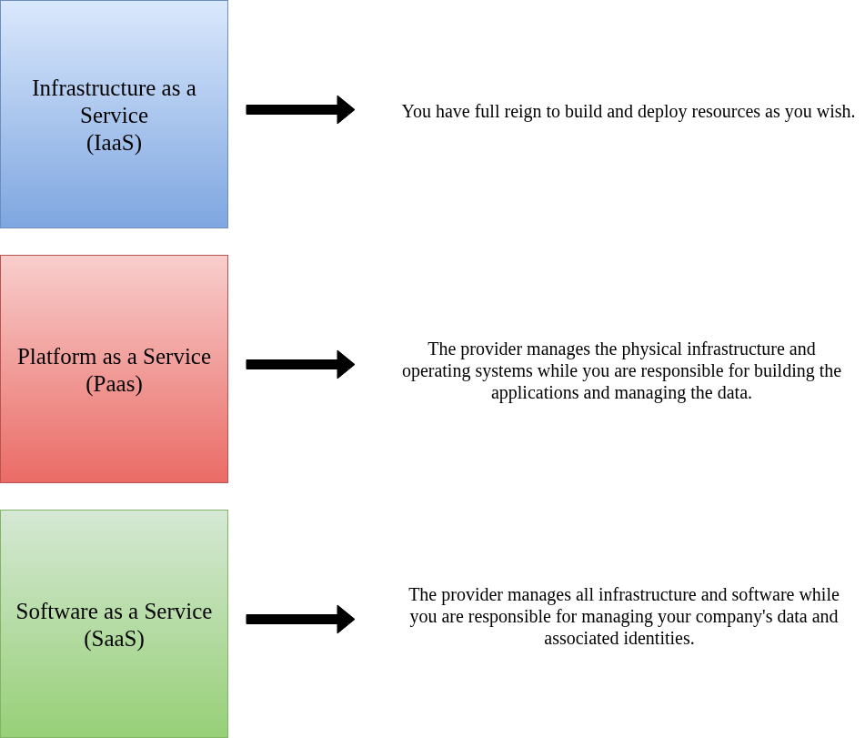 - Infrastructure as a Service (IaaS): The vendor provides various pieces of technology on demand, such as servers, storage devices, and networking devices. The customer is left to configure and maintain the virtual resources themselves. (Ex: AWS S3, which allows a business to provision storage for their data on Amazon’s own hardware rather than on local drives).
