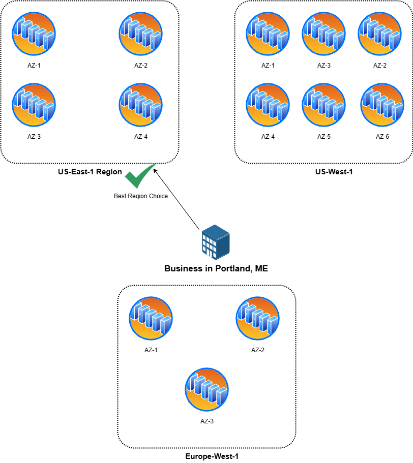 Regions: a cluster of the provider’s datacenters in a specific geographical region in the world. Oftentimes these regions have straightforward titles such as “US-East-1” or “Europe-West-2”. When setting up your cloud subscription, selecting the closest region to your location is often one of the first things you are asked to do.