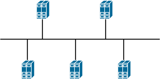 Bus: In a bus, multiple nodes are connected to a single cable. The single cable link is hooked into by each node via droplines. If the backbone cable goes down, communication is lost.