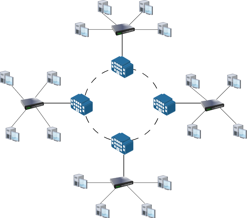 A small to medium-sized business generally deals with one or several Star topologies. Only if your network comprises multiple campuses connected over a Wide Area Network (WAN) will you be dealing with large Rings or Mesh topologies. A basic enterprise network setup consists of a router, which connects to a core switch, which then connects to multiple other switches where different network segments are configured.