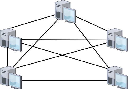Mesh: Many different nodes are connected via dedicated links. There are no intermediaries needed to forward data to one node on behalf of another; instead, every node has a direct line to every other node in the network.