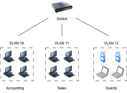 When you deploy a switch in your environment, all connected hosts exist in the same Broadcast Domain together, meaning they can talk to one another. VLANs allow you to create multiple independent Broadcast Domains on your network. One broadcast equals one VLAN, and every host assigned to one VLAN can only communicate with other hosts assigned to the same VLAN. So instead of functioning like one big network where every device in every department can see and talk to one another, your environment will now have multiple tiny, segregated networks where devices can only see and talk to devices that fulfill the same criteria as them. For example, you could create a VLAN for Administration, one for Front Desk Staff, one for Guest users, and one for the Development Team.