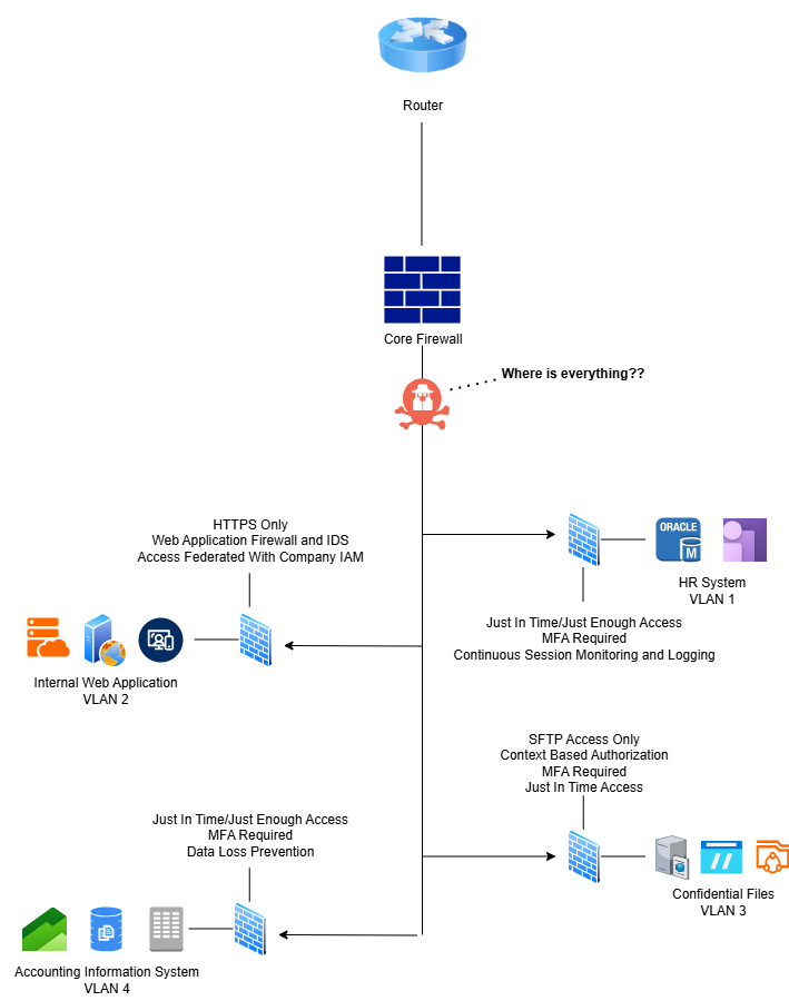 In today's digital landscape, there is a increasing trend of implementing microsegmenation. This strategy takes the idea of segmenting resources even further by creating smaller protected network segments for individual applications, processes, and services. In a typical secure network deployment, you would likely see a single VLAN for all servers, another for employee workstations, and another for ICS/SCADA devices. In a network with microsegmentation, you would see a VLAN for a web app, a VLAN for an HR system, a VLAN for a database server, and a VLAN for a financial data analysis system. Microsegmentation is a key strategy of Zero Trust. We accept that we cannot even trust neighboring servers in our own network, thus we need to isolate individual devices and services to segments for them and only them. Then we can place different security controls in front of each segment, with the controls varying depending on the context of the resources within it. We would want to configure intensive identity and access management controls and encryption on a network segment for confidential files. We would want to restrict open ports to HTTPS for a segment hosting an internal web app.