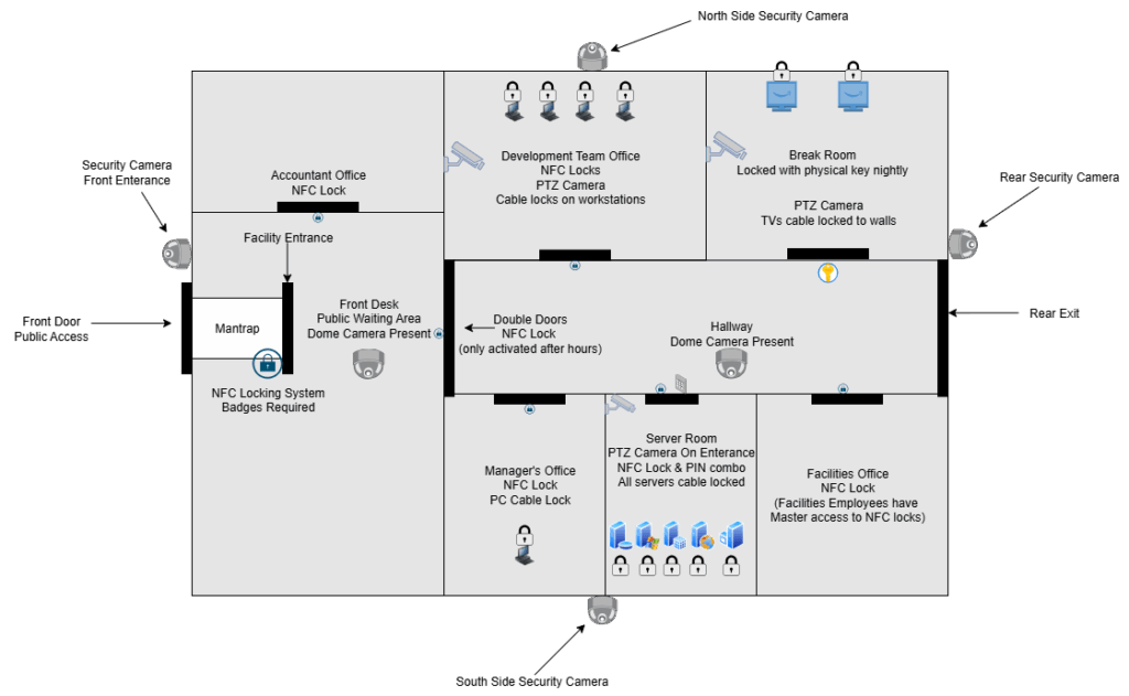 There’s a good chance that your business already has several maps of its physical layout for things like fire exits, plumbing, and electricity. A physical cybersecurity map follows the same idea as those, only with cybersecurity-relevant controls highlighted.