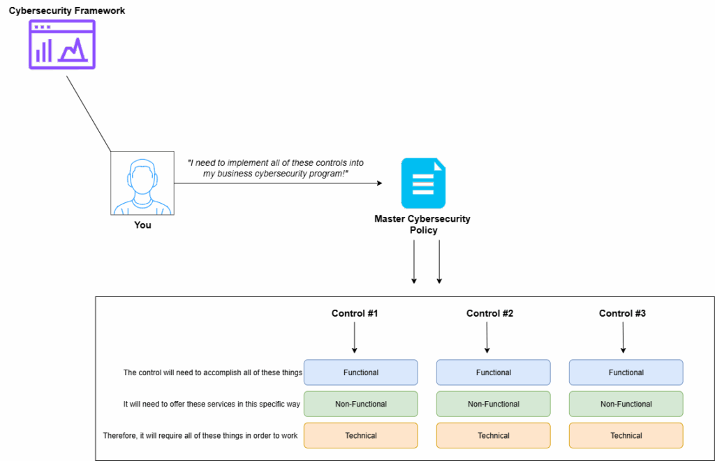 Non-Functional Requirements: These requirements are the specifics of how the individual pieces of the program will behave. For example, an MFA system needs to either deny or allow access to a user, provide 24/7 uptime, and be easily configured by an admin. In terms of this framework, non-functional requirements are all the different pieces that will be necessary to make controls behave the way they should.