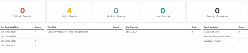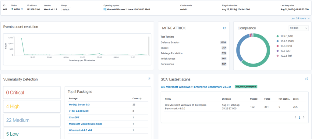 On my personal home Wazuh SIEM, I have my desktop and laptop connected. If I select my laptop for investigation, I am presented with a ton of different features on the dashboard.