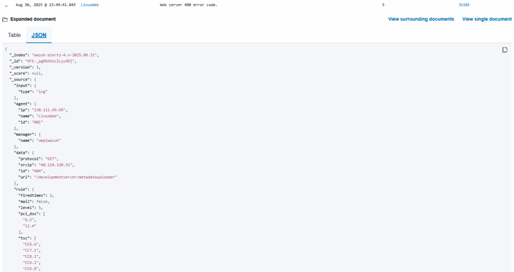 In the screenshot above, we can see a bunch of attempts at SSH access to the server. We also see a "Web server 400 error code" logged near the top. Let's expand that and look deeper.