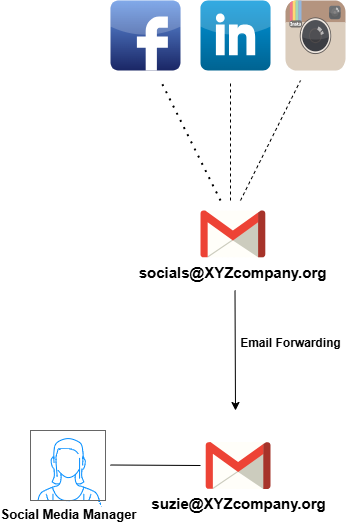 A good starting point is to treat a dedicated email address for social media-related tasks. Attaching the logins for company social media pages to a particular user's email gives the user root-level control of those pages. This is a bad security practice that has the potential to cause trouble in the case of a disgruntled employee threat. Instead, create an email address like socials@mydomain.org, or outreach@mydomain.org. You can then forward the mailbox from the chosen email address to the personal email addresses of the staff members managing the social media pages.