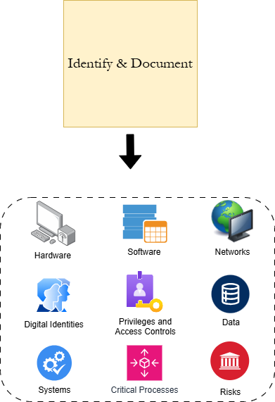 Stage 1: Identify & Document initiates the creation of the cybersecurity program by reviewing the current state of cybersecurity measures in the business environment. Inventories are made of all digital resources, including hardware, software, identities, privileges and access controls, and network infrastructure. Documentation is also made of all third-party entities involved with the environment, as well as the key stakeholders in the success of the organization's cybersecurity. This stage then requires the identification of the larger systems and data flows that make up the key day-to-day workflows that allow the organization to be successful. After a full inventory of all digital components is made, a gap analysis, business continuity plan, and risk assessment is made to identify where security is most critical and where it is most lacking. This process is supplemented with reconnaissance and security scans to identify immediate vulnerabilities. The analysis done at the closing of Stage 1 sets the groundwork planning the implementation of security controls, which will be done in the next stage.