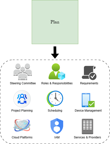 Stage 2: Plan oversees the preparation for implementing security controls to address the gaps identified in the previous stage. Planning starts by establishing a Steering Committee to ensure diverse input from all areas of the organization throughout the process of building the cybersecurity program. Roles and Responsibilities relating to cybersecurity also need to be identified to ensure stable structure in the organization. Afterwards, Stage 2 guides the organization to identify appropriate project management techniques and prepare the environment for the changes made in Stage 3. This involves comprehensive requirements gathering, scheduling of maintenance windows and blackout periods, and the creation of a staging environment to test security technologies before full implementation. After preparing the organization structure for the cybersecurity program, Stage 2 ends by presenting a variety of high-level solutions that should be considered to improve and modernize the organization's cybersecurity posture. These include embracing centralized Identity & Access Management, Identity Federation & Single Sign On across products, moving on-premises services to cloud platforms, and choosing between Workgroups, on-premises AD domains, and Mobile Device Management (MDM) for endpoint management. None of the technologies discussed in Stage 2 are required, but they are highly recommended to simplify digital resource management and make future improvements easier.