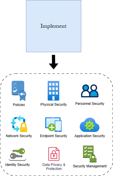 Stage 3: Implement is where cybersecurity controls are implemented into the organization. The stage begins by mandating the creation of cybersecurity policies to provide security governance at all levels. Policies govern things like acceptable use of network resources, password creation, business continuity and disaster recovery, and remote working/BYOD standards. Policies are then followed by the implementation of standards for securing the organization's premises and Human Resources practices. These controls are followed by direct technical controls for securing all areas of digital infrastructure: network hardware, systems/devices, applications, digital identities, and data. Stage 3 closes by introducing administrative practices and recommendations to assist with keeping a firm grip on the operation of new controls.