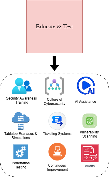 Stage 4: Educate & Test ends the process by helping administration ensure smooth implementation and use of the cybersecurity program and its associated controls. The framework understands that humans are the weakest and most vulnerable component in any security program. Thus, constant education and training need to be implemented to keep the organization secure. Employee Security Awareness Training is emphasized as a non-negotiable part of the program, with ideas for simulations and tabletop exercises provided to make education training interactive and collaborative. Changes to business culture regarding cybersecurity are also recommended, with the ultimate goal of establishing a comfortable "Culture of Security" where all employees feel comfortable voicing their opinions, concerns, and experiences. Stage 4 then shifts to the training portion. Strategies are provided for regularly testing the effectiveness of the security program and searching for emerging threats and vulnerabilities. These strategies include penetration testing, vulnerability scanning, and integration of threat intelligence sources into the workplace. Stage 4 concludes by setting a requirement for regular audits of the cybersecurity program. These Audits are essentially carbon copies of the Gap Analyses performed in Stage 1, therefore initiating another iteration of the framework when necessary.