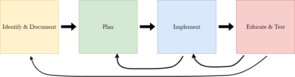 A single iteration of the framework may also require going back and forth between different stages. The ultimate goal is to have a complete cybersecurity program, not a quick one. Therefore, you may find that some controls integrated in Stage 3: Implement require you to return to Stage 2: Plan to make adjustments to your initial program plan. While performing tasks in Stage 4: Educate & Test, you may also find that some controls need to be fine-tuned, hence requiring you to return to Stage 3: Implement. I have injected several project management standards into the planning stage of the framework to try and minimize scope creep and make the framework as smooth flowing as possible.