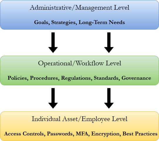 A good cybersecurity program needs to start from the top. Good security practices need to be implemented within the business management and then worked down the chain into the lowest-level operations. This is done by starting with high-level security goals and then breaking them down into granular controls and policies.