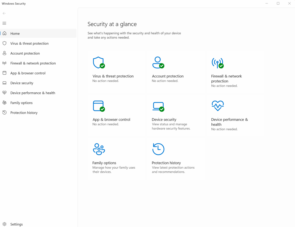 Ensure that Windows Defender & Windows Firewall are Enabled: Windows has two built-in security services that act as defense for the system. Windows Defender (Windows Security) is the Windows built in malware scanner. Windows Defender can protect your systems against a variety of cyber threats. Defender should always be turned on unless you have implemented a separate third-party anti-malware solution. Windows Firewall is a host-based firewall appliance that allows and blocks connections to systems. While a network firewall is usually relied upon to block malicious external connections, host-based firewalls are necessary to further harden endpoints. Under no pretexts should Windows Firewall be disabled. There are three firewall states for the application: Public, Private, and Domain. All three should remain enabled to protect systems on different network security deployments.