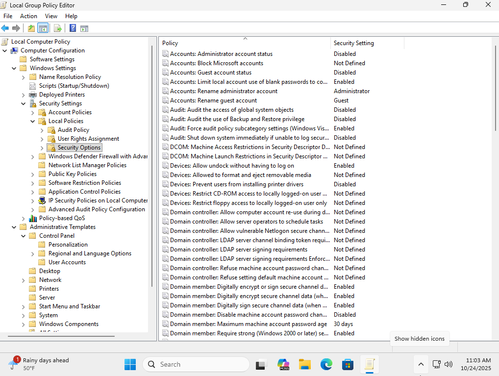 13. Once the system is restarted, you can navigate to your Local Group Policy snap in and see that the baseline settings have all been imported into your system.