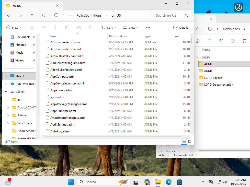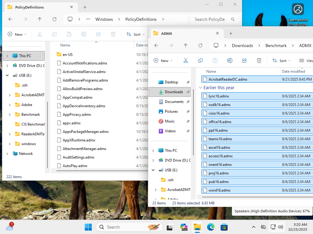 2. Navigate to the ADMX subfolder. In a new File Explorer tab, navigate to C:\Windows\PolicyDefinitions. Copy all of the .admx files from the ADMX subfolder into the PolicyDefinitions folder.